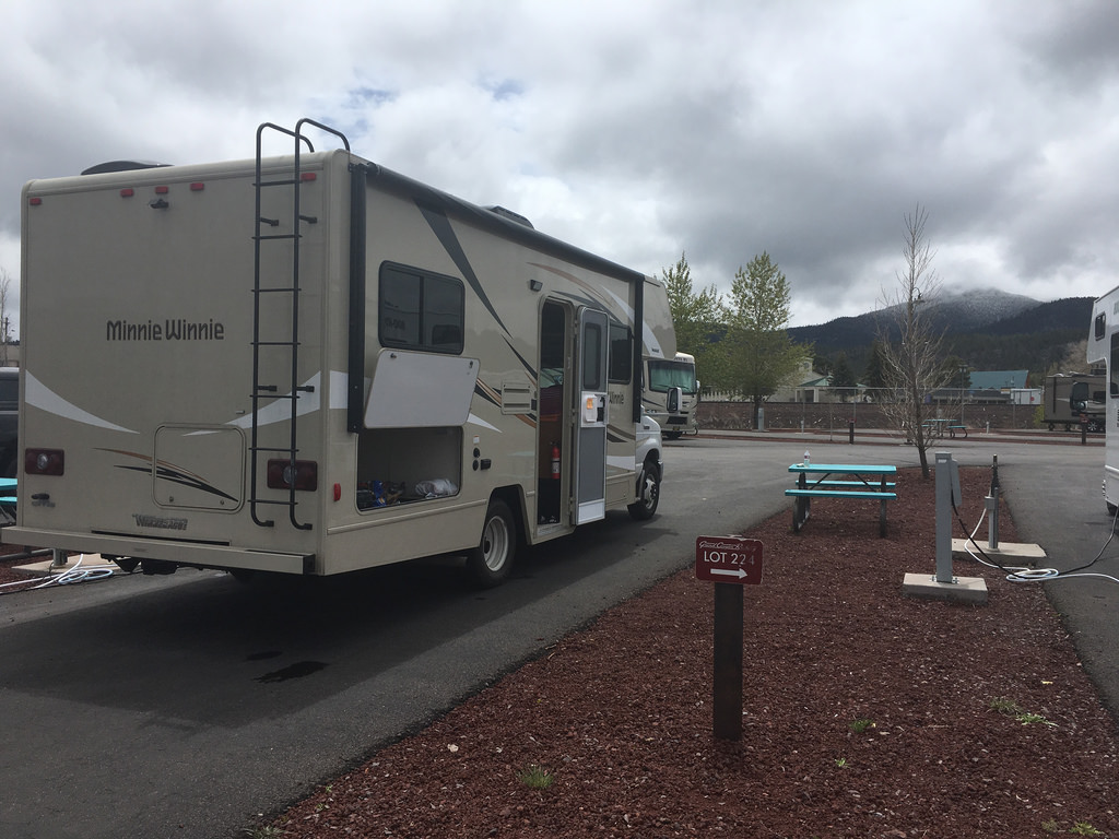 Auf der Strecke von Buckeye nach Williams erwartet uns erneut ein sehr wechselhaftes Wetter. Wir starten bei Sonnenschein, kommen in den Regen und auf 7.000 Fuß erwartet uns dann sogar Schnee. Spätestens jetzt haben wir gefühlt alle vier Jahreszeiten durchlebt. Die Straßen sind teilweise so nass, dass wir nur sehr langsam vorankommen. Aber da wir Zeit haben, ist es nicht schlimm. Da die Strecke nicht so lang ist, kommen wir bereits zur Mittagszeit auf dem Grand Canyon Railway RV Park an. Nach kurzer Suche finden wir dann auch das Büro, um einzuchecken. Da noch weitere Wohnmobile die Straße rauf und wieder runter fahren, sind wir wohl nicht alleine auf dieser Suche. Dies gesuchte Büro liegt hinter dem Hotel, welches zum Areal gehört.