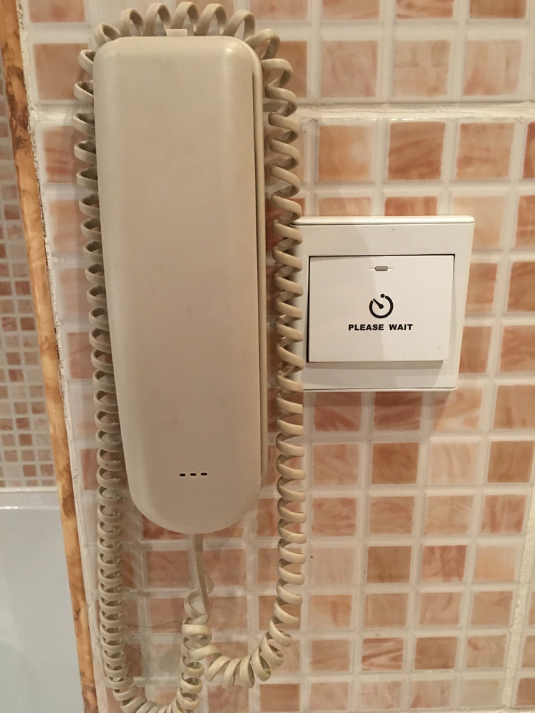Wir haben einen „Please Wait“ Knopf im Badezimmer neben der Toilette und dem dort befindlichen Telefon gefunden. Wir haben lange nachgedacht, wofür dieser Knopf gut ist. Eine Beschreibung dafür gab es nicht, also haben wir beim Check-out einfach mal nachgefragt. Die Lösung ist ganz einfach und eigentlich ist es keine schlechte Idee. Der Knopf befindet sich neben dem WC, denn wenn man sich gerade dort befindet und der Room-Service an der Tür klingelt, kann man diesen Knopf drücken. Dann weiß die Person vor dem Zimmer, dass sie noch etwas warten muss bis sich die Tür öffnet, da man „verhindert“ ist.