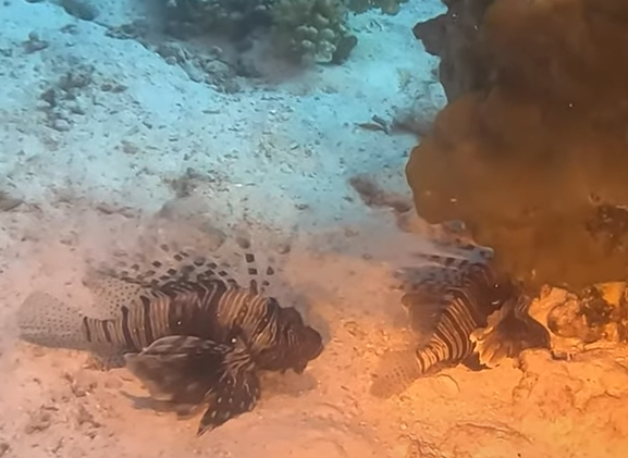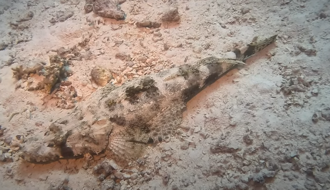 Unser Guide, Hischam (auch Amr genannt) zeigt auf eine unscheinbare Stelle im Sand. Erst beim zweiten Hinsehen erkennen wir, dass sich hier ein Krokodilfisch, perfekt getarnt mit seinem flachen, sandfarbenen Körper und den markanten Augen, ein Ruheplätzchen gesucht hat. Regungslos liegt er da und wartet auf Beute. Wenige Meter weiter entdecken wir einen Steinfisch. Auch dieser ist fast nicht zu erkennen zwischen den Korallen. Sein Tarnkleid ist so perfekt, dass er wie ein Stück des Riffs selbst wirkt. Diese Begegnungen erinnern uns daran, wie unglaublich gut angepasst und zugleich gefährlich schön die Unterwasserwelt sein kann.