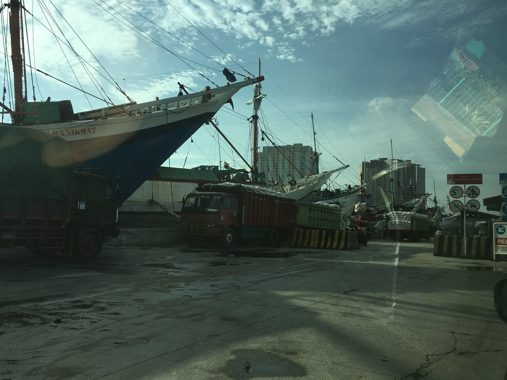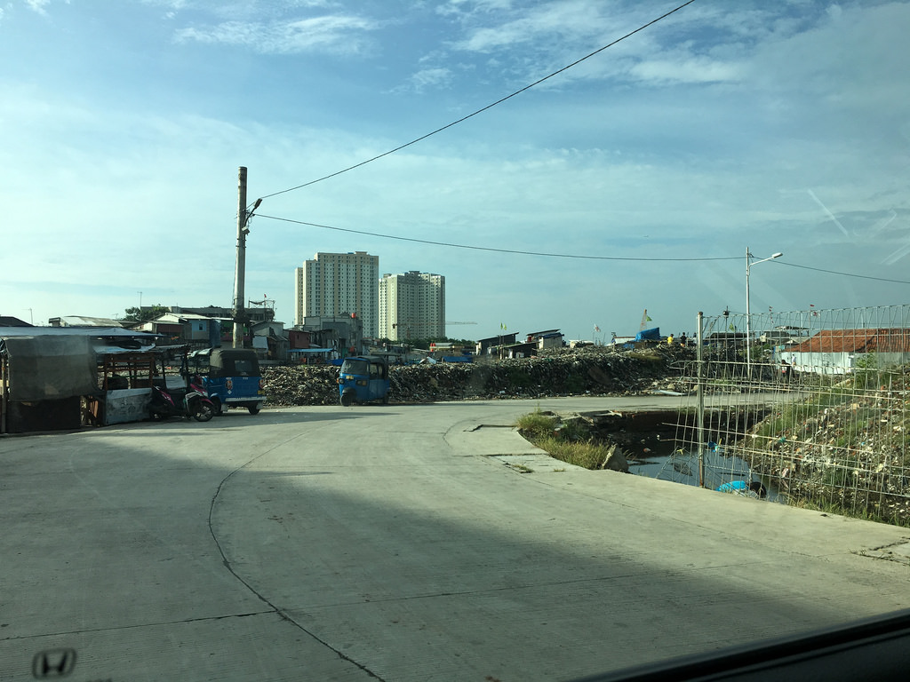 Der Verkehr in Jakarta hat jetzt doch deutlich zugenommen. Benny erklärte uns, dass jetzt nach und nach der Feierabend-Verkehr startet, so dass wir nun recht viel Zeit auf der Straße verbringen werden. Benny fährt mit uns in Richtung Old Port. Links und rechts der Straße befinden sich die ärmeren Gebiete von Jakarta. Wir haben versucht hier nicht offensiv die Kamera einzusetzen. Insofern haben wir auch hier nur ein Foto aus dem Auto heraus gemacht.