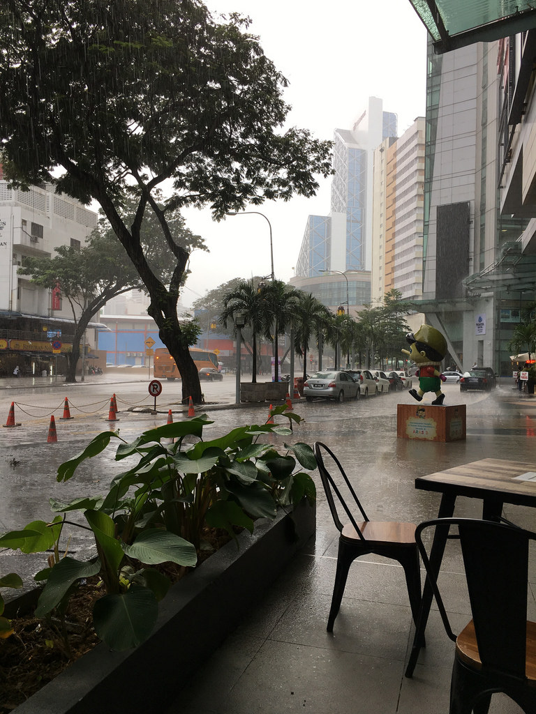Während unseres Aufenthalts in Kuala Lumpur konnten wir die Uhrzeit fast anhand des einsetzenden Regens erkennen. Pünktlich zwischen 14:30-15 Uhr öffnete der Himmel seine Pforten und es wurde nass. In den vergangenen Tagen hörte es meist innerhalb einer Stunde wieder auf zu regnen und ging dann erst am Abend oder in der Nacht weiter. Heute war es jedoch anders. Auch nach dem zweiten Kaffee und dem wiederholten Rundgang im Kaufhaus wollte der Regen einfach nicht aufhören. Also haben wir nach den überdachten Fußgängerbrücken und/oder Tunneln Ausschau gehalten. Leider gab es in dieser Gegend nicht überall die Möglichkeit trocken von A nach B zu gelangen. Dies führte dazu, dass wir zwar nach 3 Minuten laufen an einer dieser tollen überdachten Brücken angekommen waren, jedoch waren wir zu diesem Zeitpunkt schon komplett durchnässt.