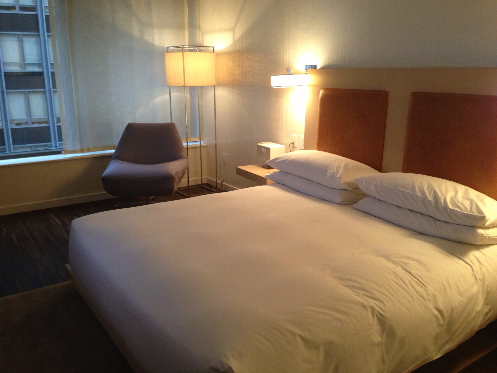 In New York haben wir uns für eine zentral gelegene Unterkunft entschieden. Unsere Wahl fiel auf das Hotel Andaz Wall Street. Das Hotel hat auf uns direkt beim Check-in gefallen. Hier gibt es nicht die noch immer weit verbreitete klassische Rezeption, sondern eine zentral platzierte Station, an denen die Mitarbeiter Gäste über ein Tablet schnell und unkompliziert einchecken. Unser modernes Zimmer war mit einem Kingsize Bett, Schreibtisch, Sessel, Fernseher und einem stylischen und dennoch funktionalem Badezimmer ausgestattet.