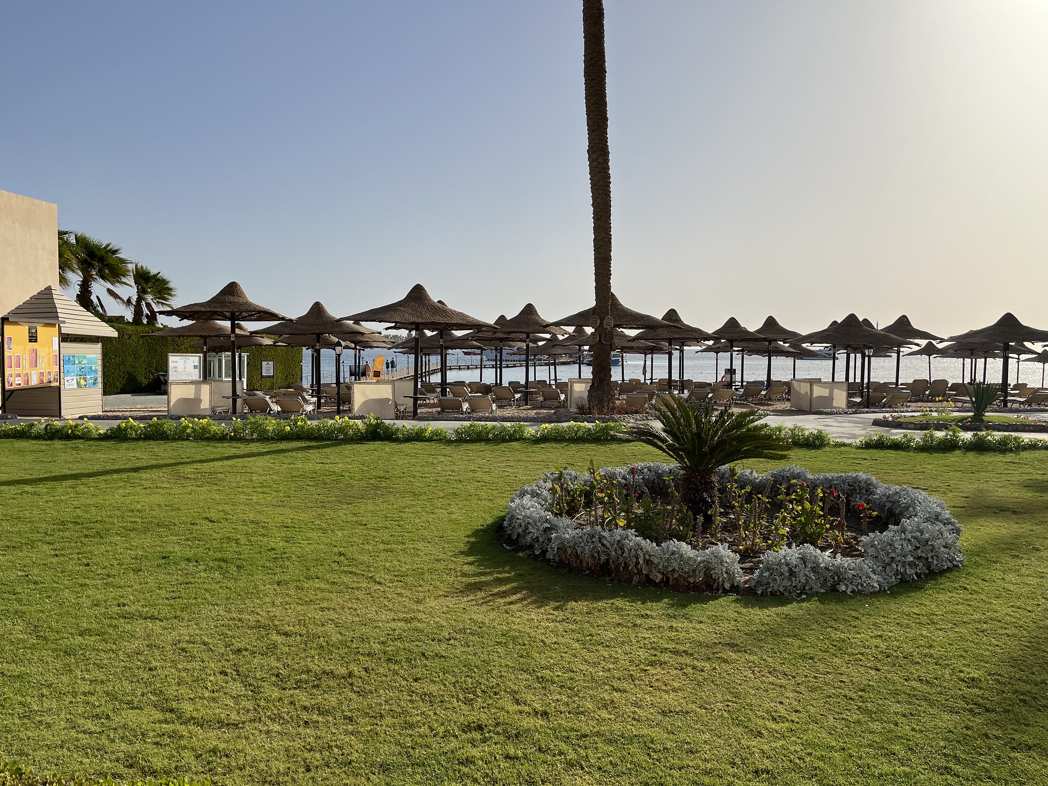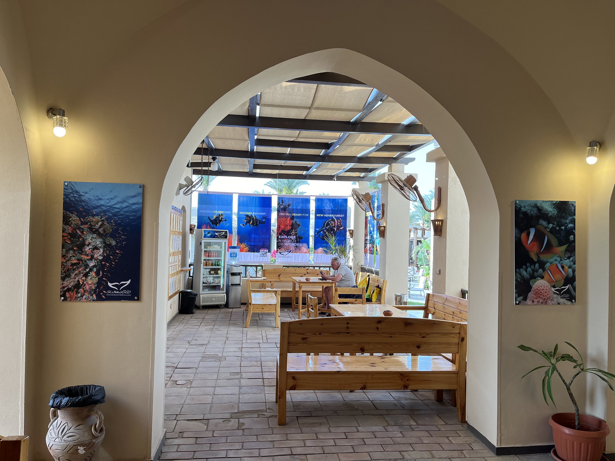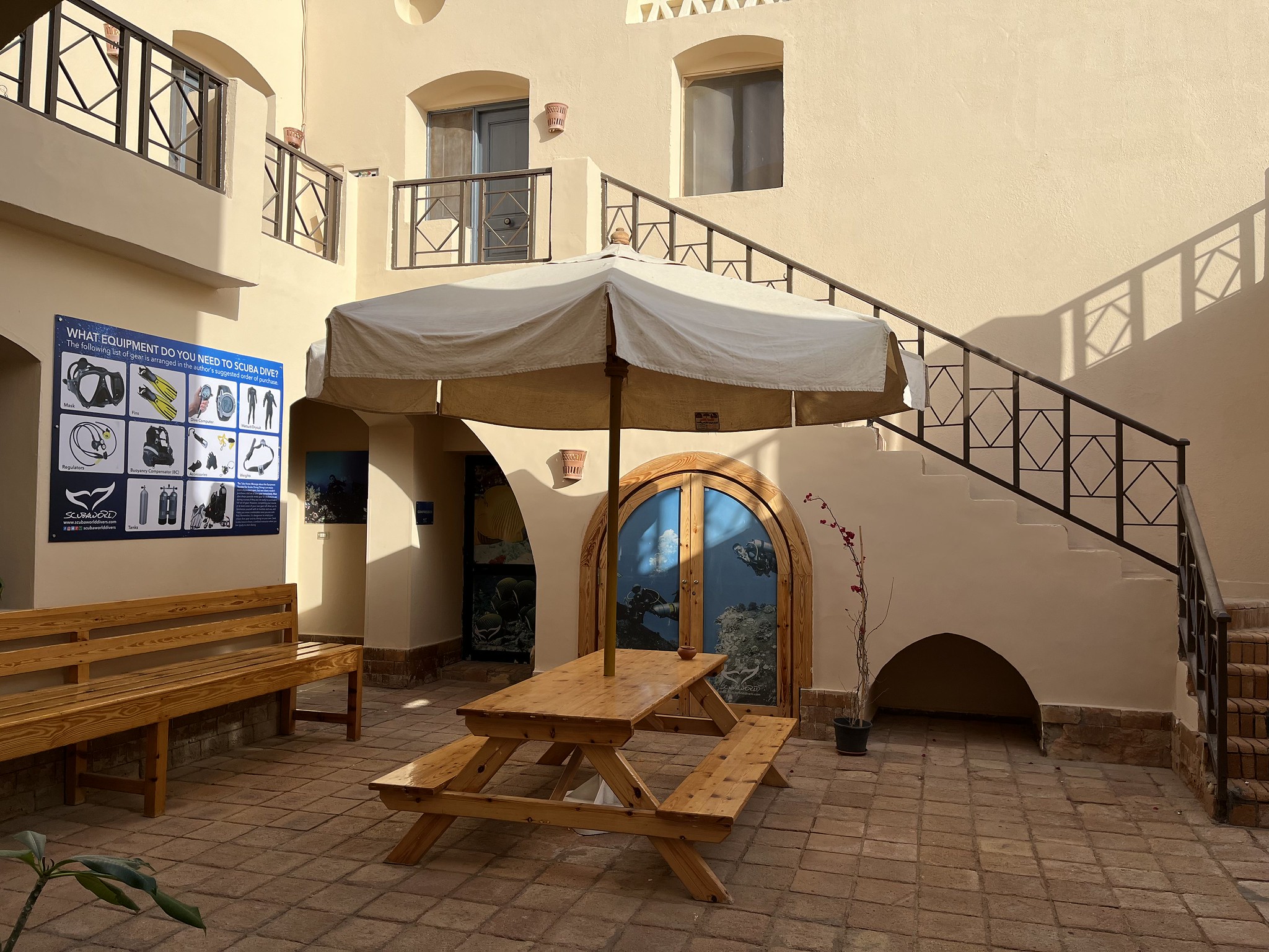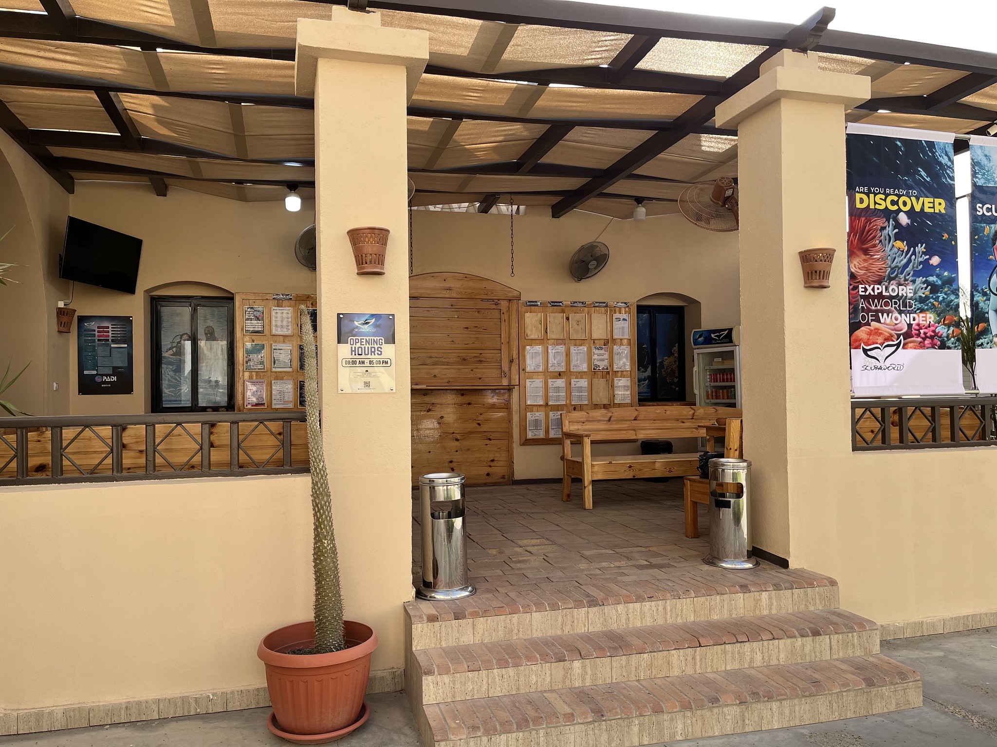 Es gibt überdachte Parkplätze vor dem Jaz Makadina Resort und um zum Tauchcenter zu gelangen, müssen wir auch nicht durch das Hotel, sondern können einen kleinen Weg neben dem Hoteleingang nutzen. Und das war es auch schon, wir sind am Tauchcenter von den Scuba World Divers in der Makadi Bay angekommen.