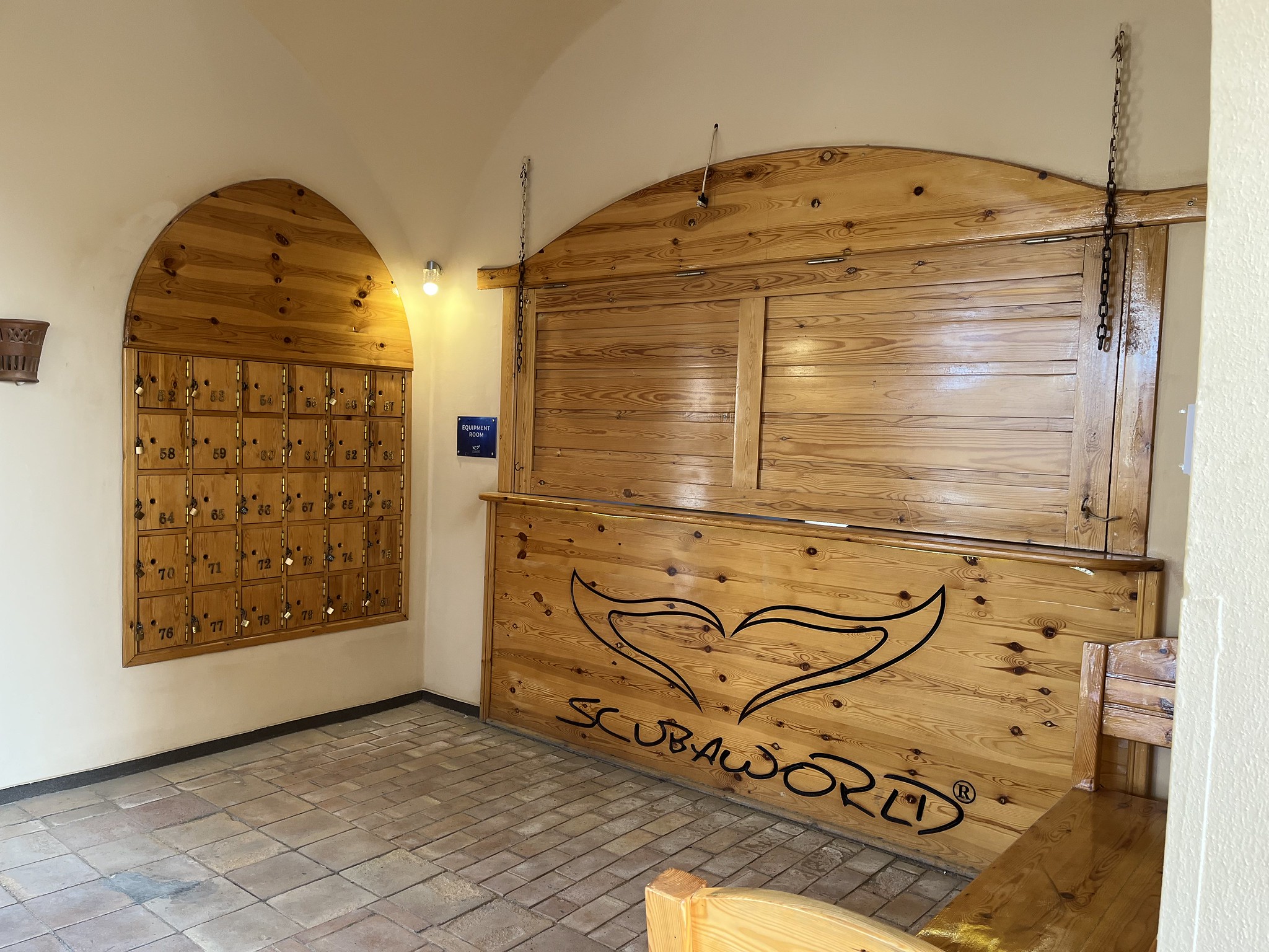 Jeder Taucher erhält eine Plastikkiste für seine Tauchausrüstung sowie eine abschließbare Box, in der wir die Ausrüstung lagern können. Darüber hinaus gibt es passend zur Boxnummer noch zwei Bügel im Raum für das Lagern / Trocknen der Tauchanzüge und BCDs sowie zwei Holzhaken, um die Tauchschuhe / Boots trocknen zu können.